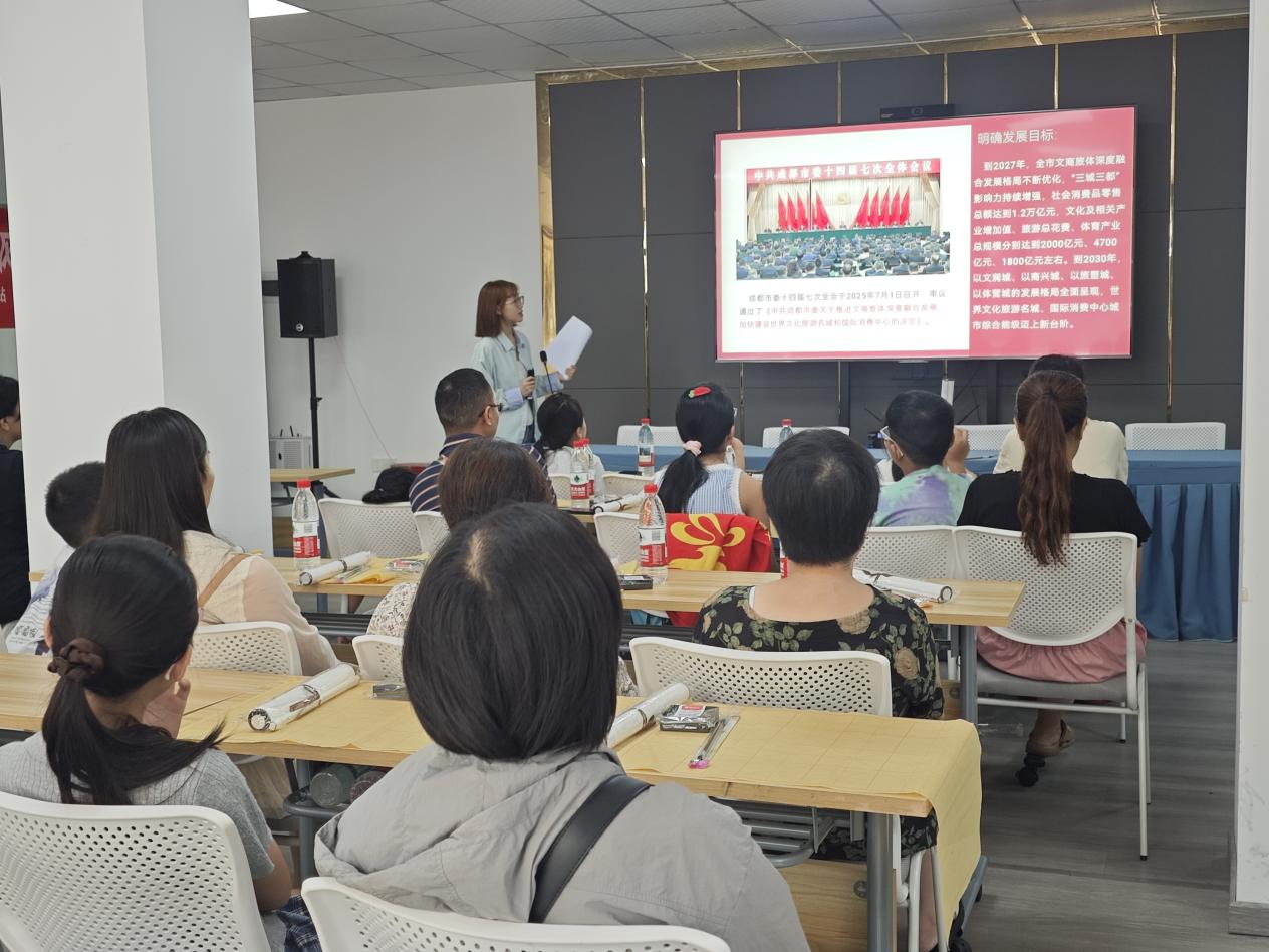 为深入学习贯彻成都市委十四届七次全会精神,推动全会部署的 “文商旅体融合发展” 战略在基层落地见效,切实让政策红利惠及社区居民生活,9月6日上午,成都市新都区桂湖街道锦水苑社区组织开展了主题为“聚焦成都市委十四届七次全会精神,文商旅体融合点亮新都生活”的专题宣讲活动。本次宣讲由基地宣讲志愿者主讲,社区居民、社区工作者等20余人到场参与。
