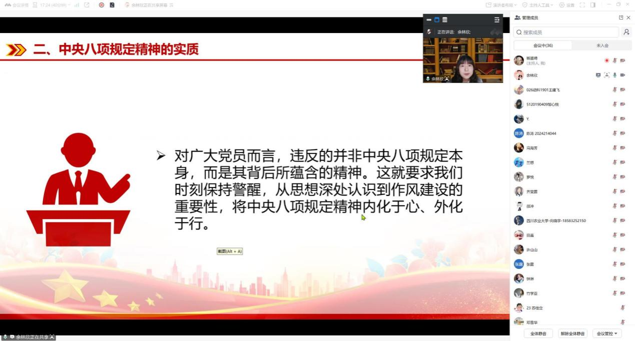 2025年7月6日,为深入学习贯彻党的二十届三中全会精神,动物营养研究所硕士研究生第三党支部与第四党支部邀请基地宣讲志愿者余林欣作题为《学习中央八项规定精神,坚守廉洁自律阵地》专题宣讲。