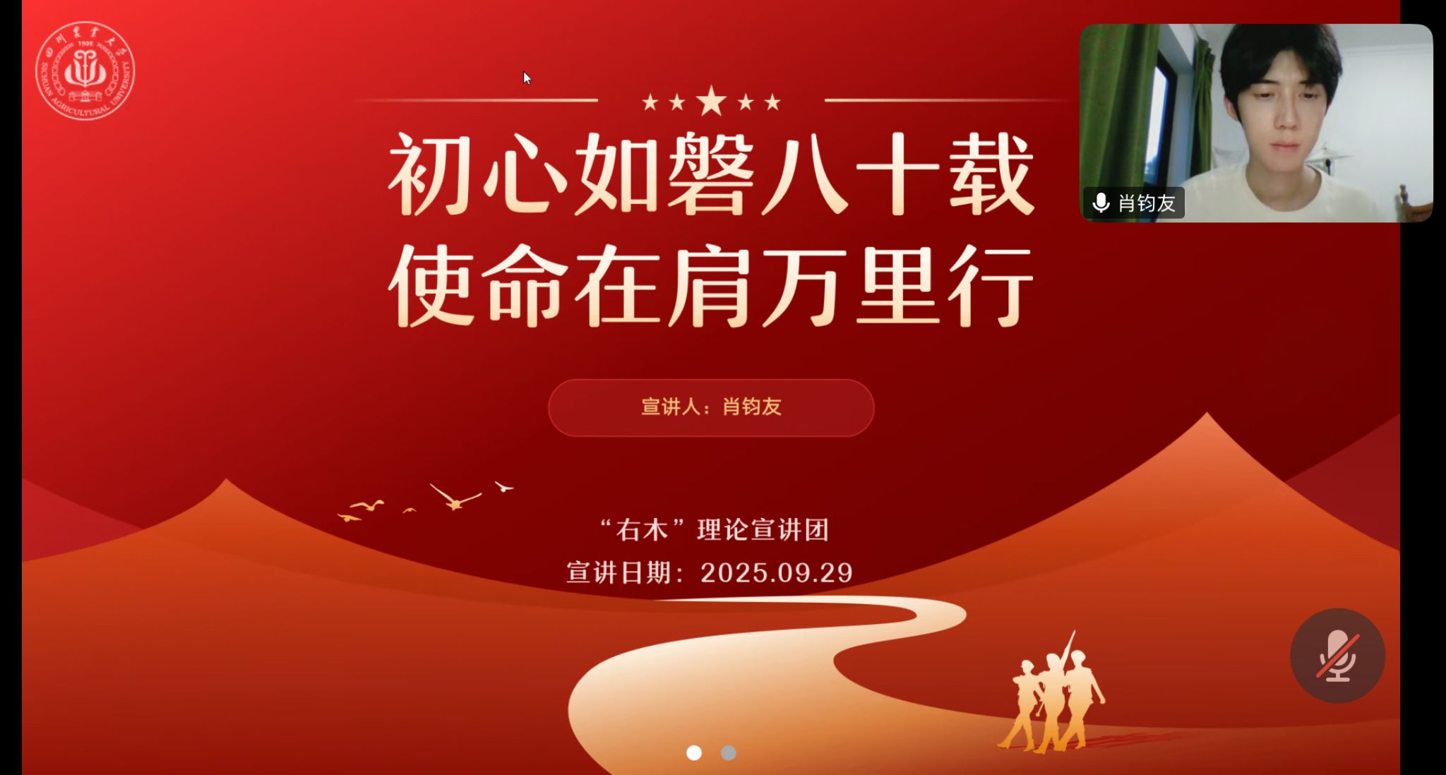 2025年9月29日晚7时,基地志愿者肖钧友应动物科技学院研究生第三党支部邀请,通过线上方式为该支部组织生活会作题为“初心如磐八十载,使命在肩万里行”的主题宣讲。