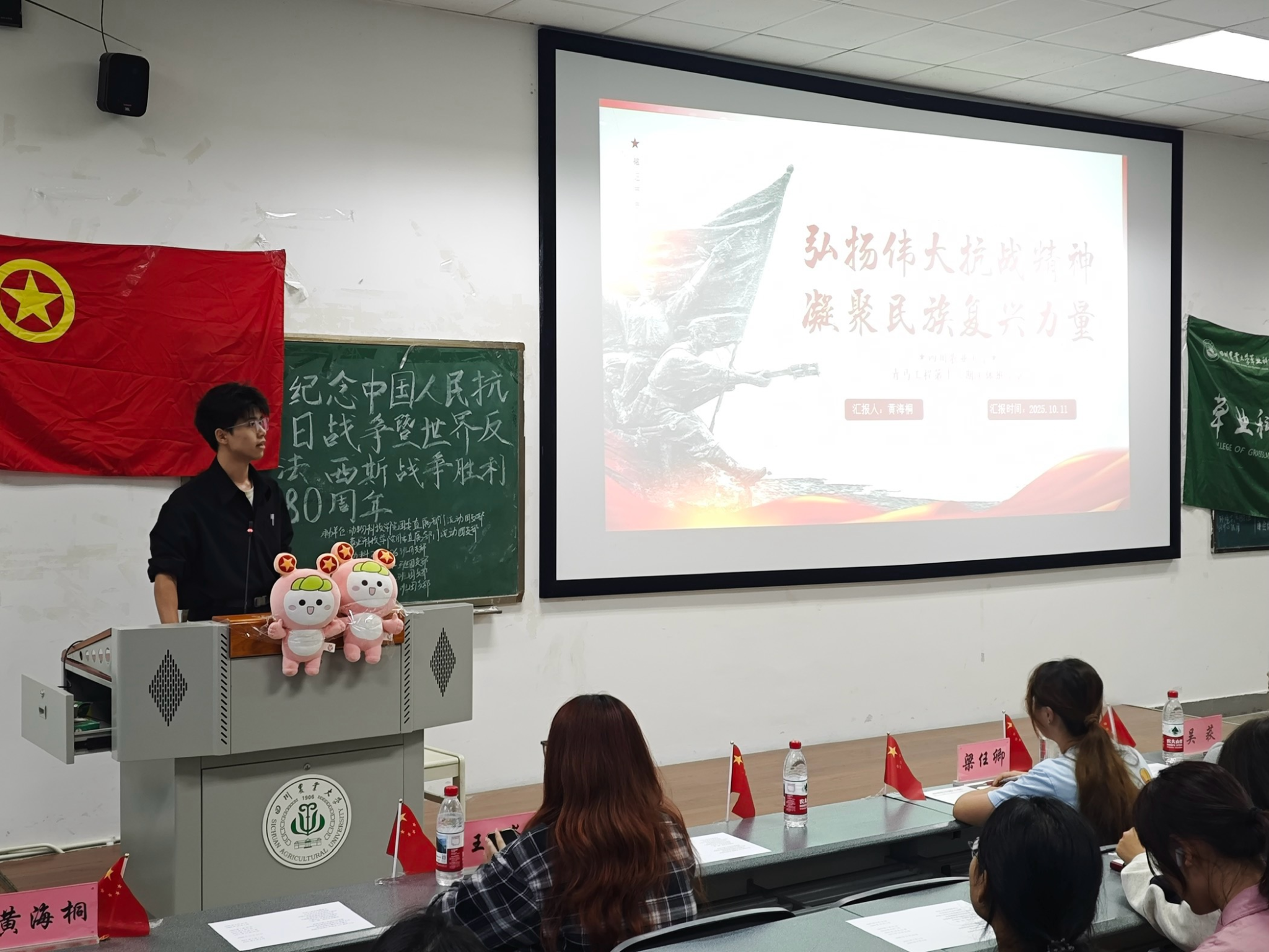 为深切缅怀革命先烈、赓续红色血脉,进一步传承弘扬伟大抗战精神,引导青年学子将爱国情、强国志转化为报国行,2025年10月11日,四川农业大学基地宣讲志愿者黄海桐受邀走进草业科技学院和动物科技学院联合举办的班团活动,给支部各位同学带来《缅怀历史・纪念先烈》专题宣讲。