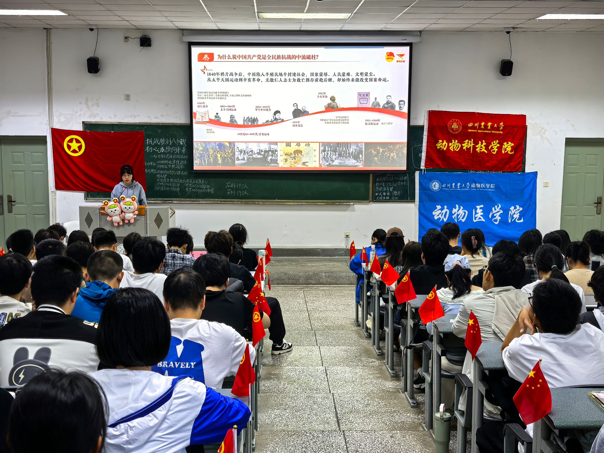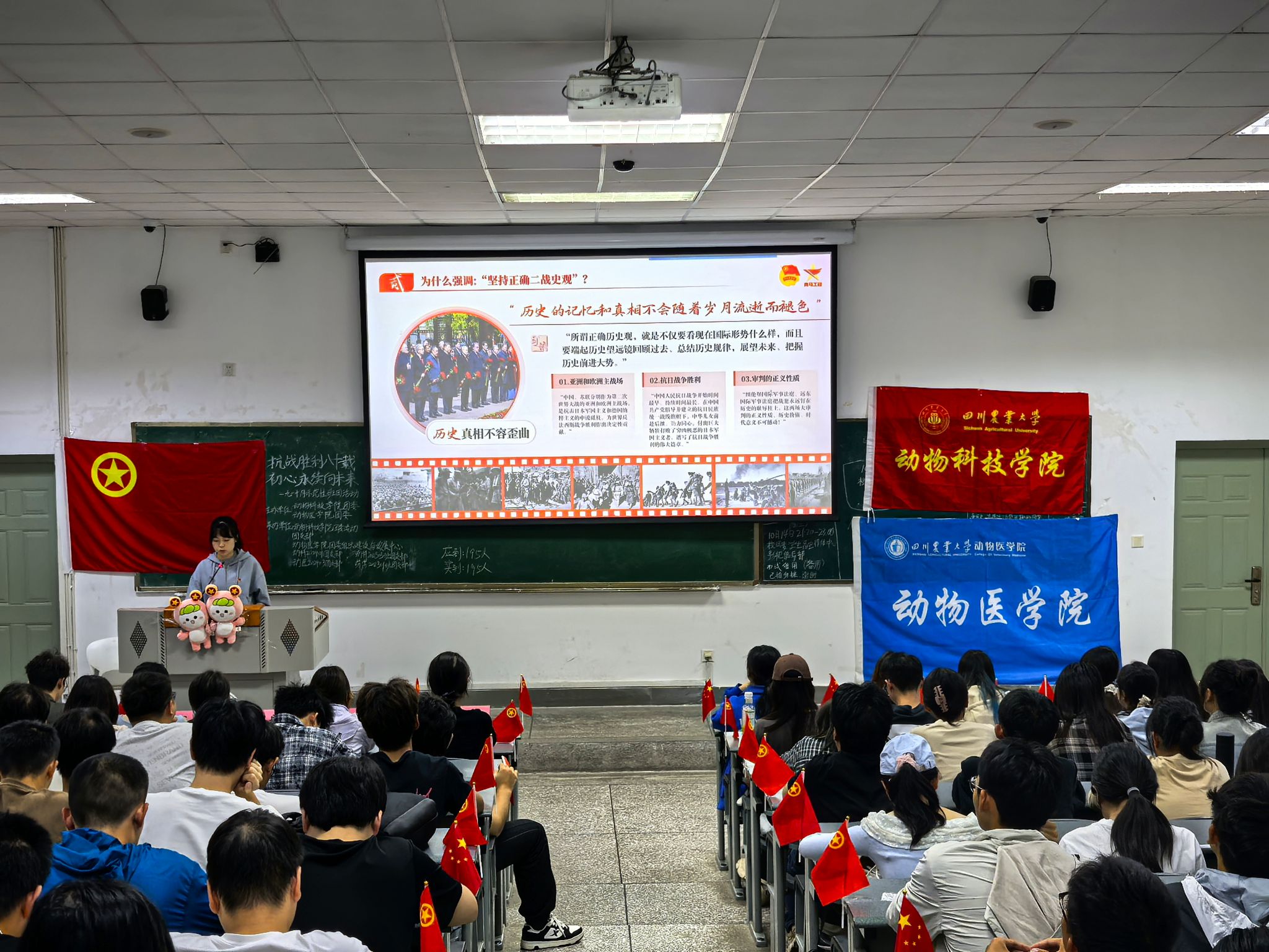 为传承伟大抗战精神,引导青年学子将专业理想与家国使命紧密结合,2025年10月14日下午,基地宣讲志愿者谈倩走进四川农业大学动科202401班、动医202403班、动科202503班、药学202301班联合团日活动现场,为四个班级共195名学子带来以“铭记胜利八十载,赓续初心万里程”为主题的宣讲,让红色基因在涉农涉医专业青年群体中焕发新活力。