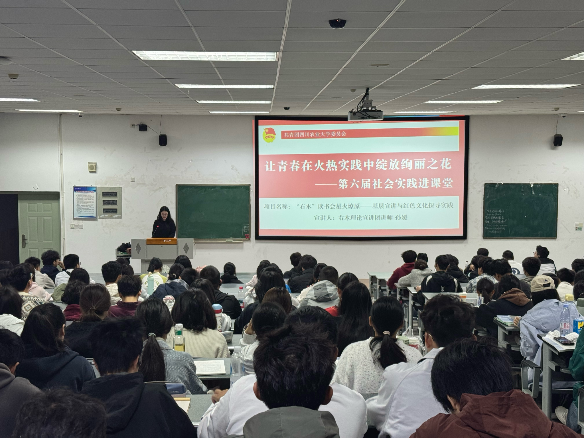 2025年10月28日,由校团委与马克思主义学院共同遴选的第六届“社会实践成果进思政课堂”宣讲团代表、基地宣讲志愿者讲师孙媛,走进农学专业 2025级1-5班及植物保护专业 2025级1-4班形势政策课堂,以“让青春在火热实践中绽放绚丽之花——第六届社会实践进课堂”为主题开展宣讲,近300名新生现场聆听。