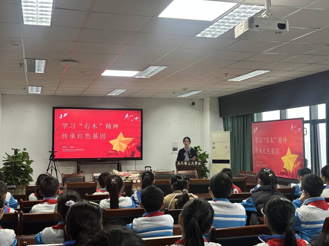 11月5日上午,在四川农业大学马克思主义学院1607教室,基地宣讲志愿者面向温江区公平学校的学生,开展了一场题为《学右木精神,传红色基因》的红色主题宣讲活动。本次活动旨在深入推进红色文化融入校园,让革命精神在青少年心中生根发芽。活动以生动讲述、情景带入、互动交流等方式,引领孩子们走近革命先驱王右木的光辉一生,在童心中播撒理想信念的种子。