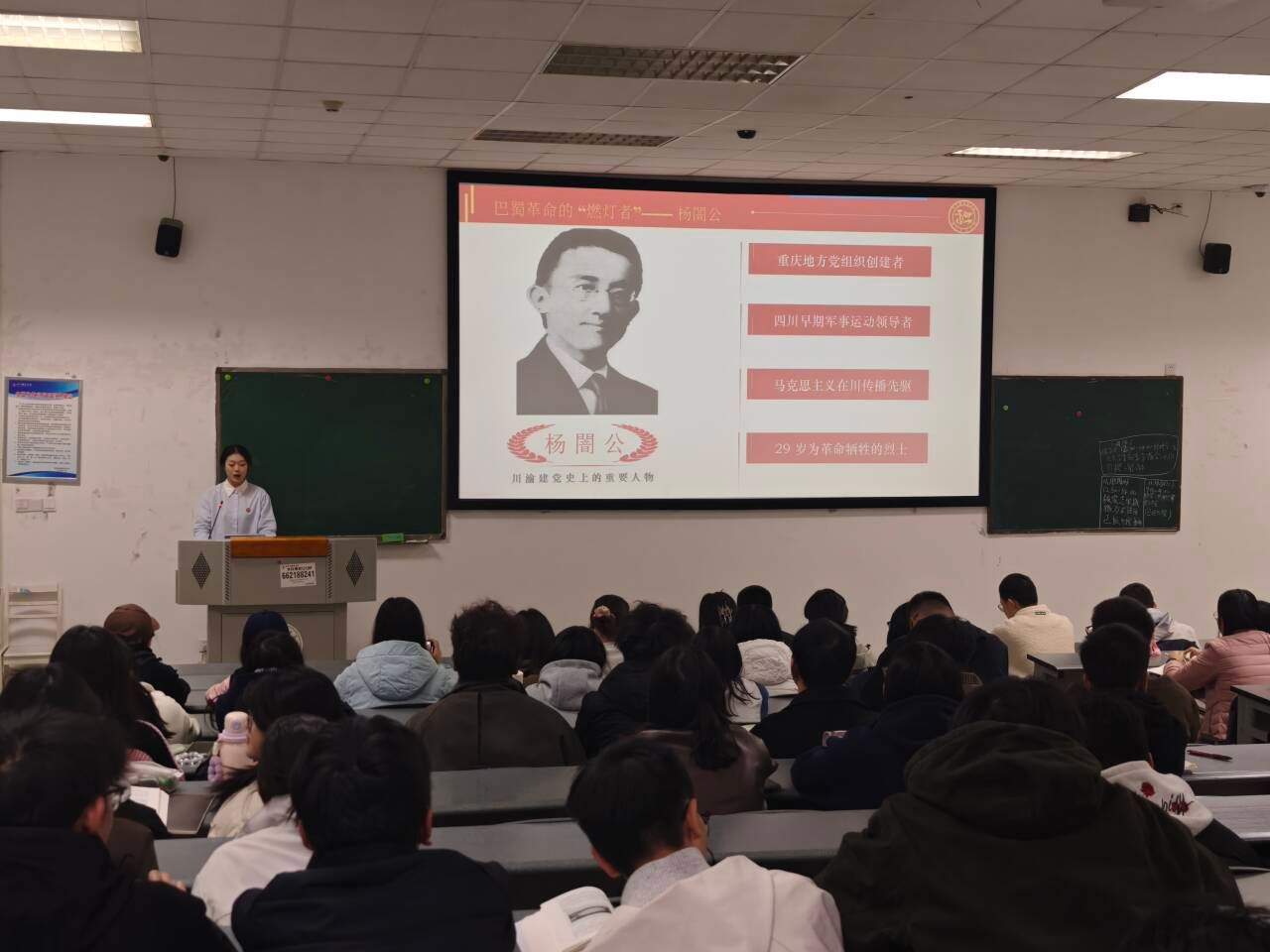 为推动红色基因深度植入大学生成长根系,引导青年学子从革命先烈的感人事迹中汲取奋进力量。2025 年 11 月 17 日基地志愿者王诗宇走进四川农业大学课堂,为环境生态、农业经济管理专业 170 余名本科生作《杨闇公的革命人生与精神传承》主题宣讲。她以杨闇公烈士的热血事迹为鲜活载体,将红色精神融入宣讲全过程,打造出一堂有温度、有深度、有力量的生动思政课。