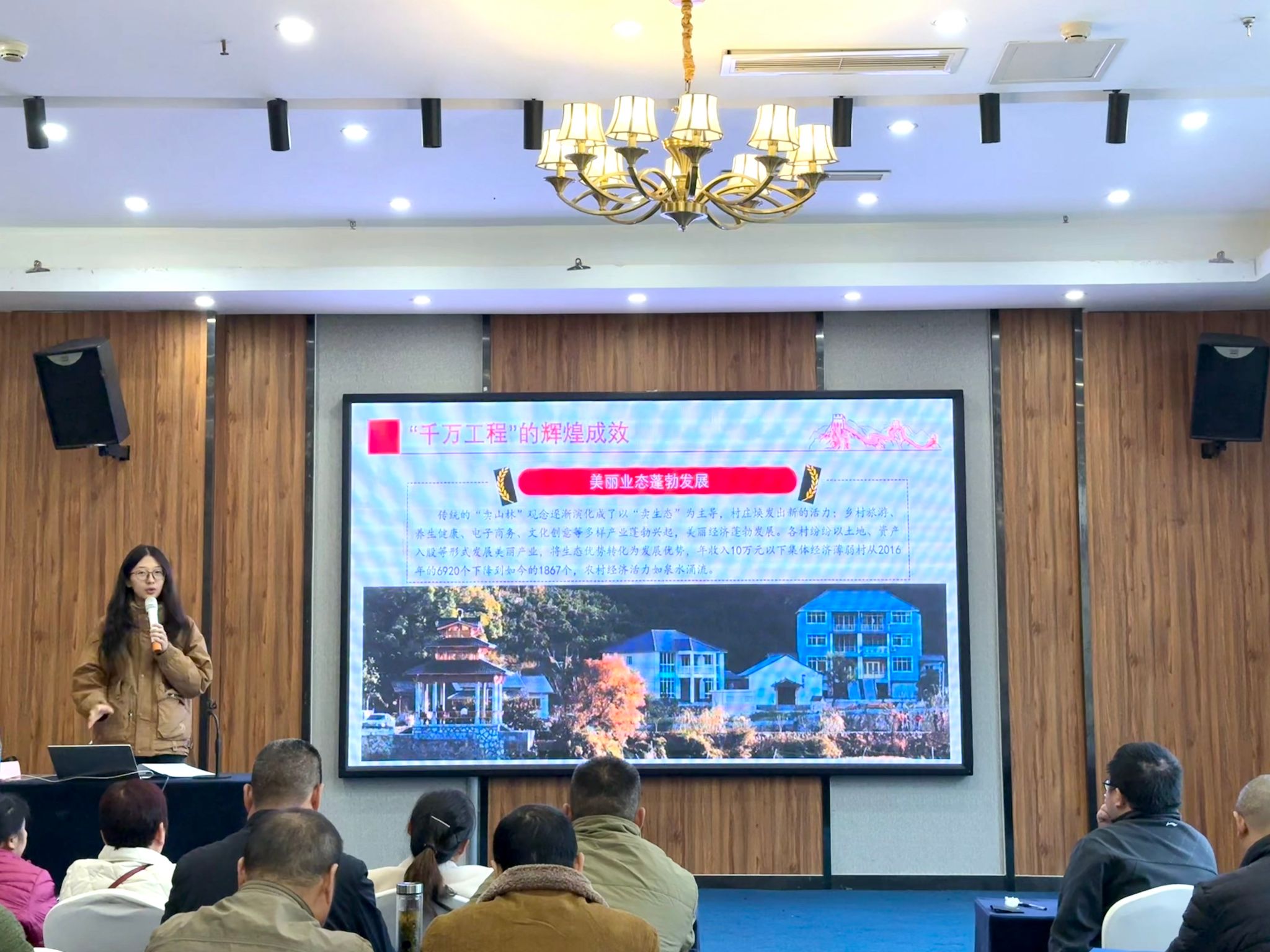 随后,郭悠然以浙江省“千村示范、万村整治”工程为主线,通过坛头村、梅林村、南浔区旧馆街道等生动案例,详细介绍了“千万工程”从环境整治到产业升级、从美丽乡村到未来乡村的演进路径,展现了浙江在生态建设、数字治理、文化振兴、共同富裕等方面的实践成果。她为学员介绍了“四位一体”治理体系在推动乡村持续发展中的重要作用。在宣讲结尾,鼓励在场学员积极学习“千万工程”经验,立足本土资源,发展特色产业,推动农业高质高效、乡村宜居宜业、农民富裕富足。