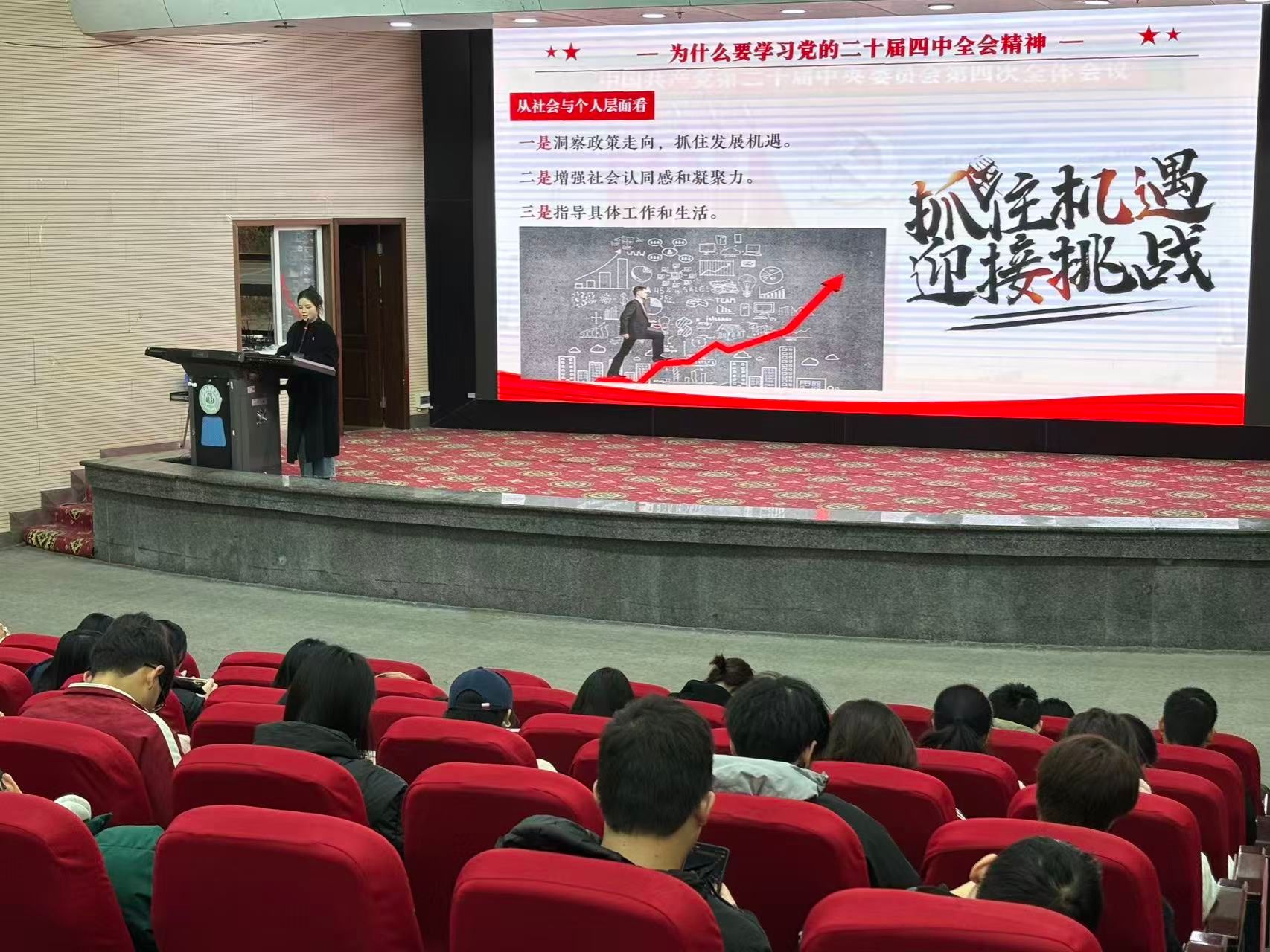整场宣讲内容丰富、逻辑清晰、论述深刻,现场学习氛围浓厚。与会学生代表纷纷表示,通过此次宣讲,对党的二十届四中全会精神有了更全面、深入的认识,将进一步坚定理想信念,锤炼过硬本领,将学习成果转化为砥砺前行的动力,努力在实现民族复兴的赛道上跑出当代青年的好成绩。