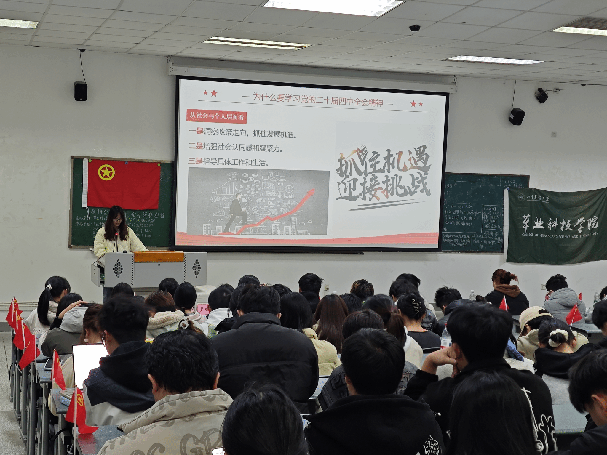 宣讲会上,刘静围绕“为什么要学习党的二十届四中全会精神”“我国的重要会议制度”“党的二十届四中全会核心内容”三个方面展开系统阐述,结合生动案例与时政热点,为同学们进行了细致解读。她重点阐述了坚持把解决好“三农”问题作为全党工作重中之重的重要意义,并联系草业学科特色,引导同学们深刻理解全面深化改革在推进中国式现代化进程中的关键作用。