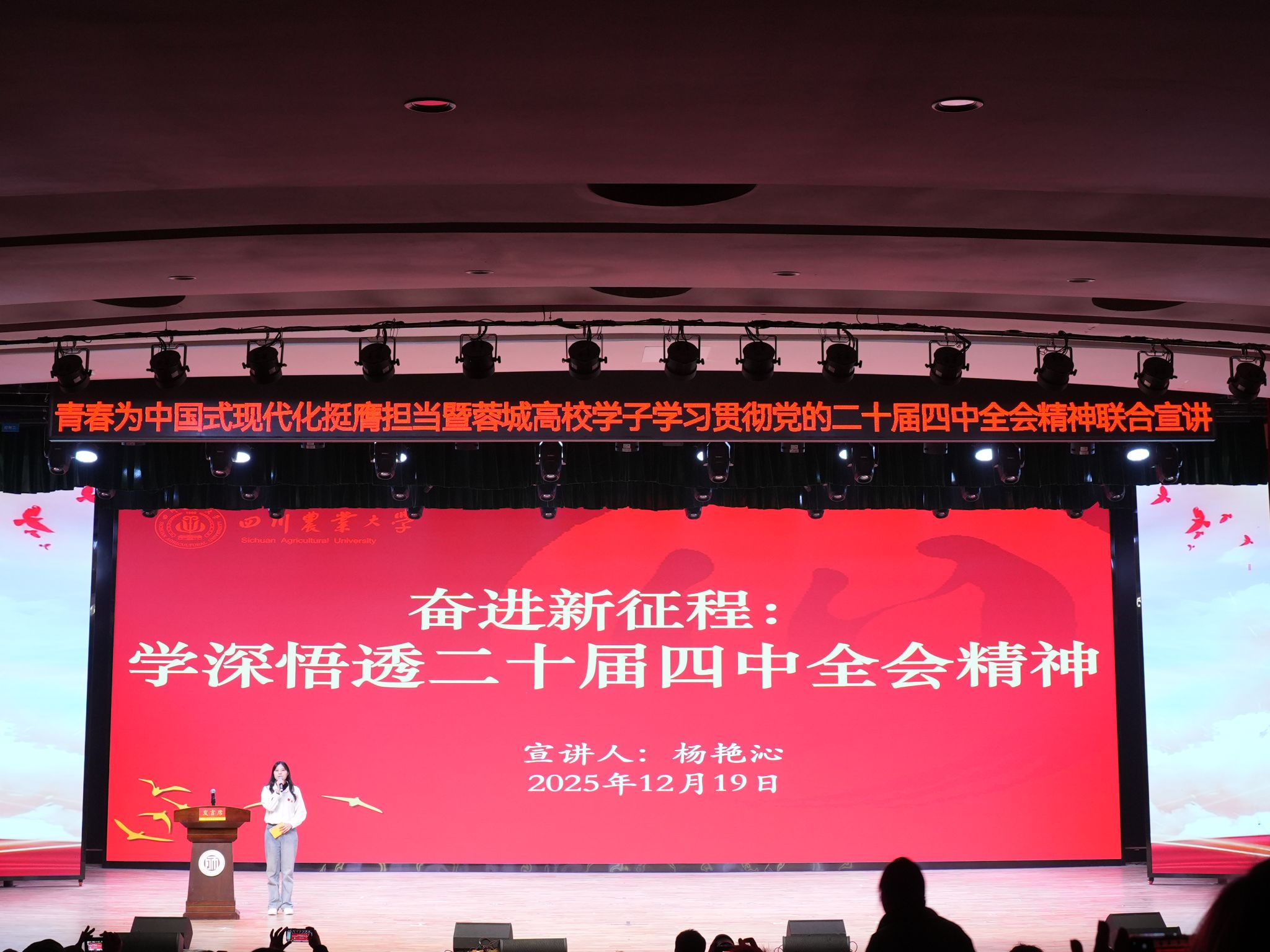为深入学习贯彻党的二十届四中全会精神,12月19日,基地宣讲志愿者杨艳沁走进成都师范学院开展《奋进新征程——学深悟透党的二十届四中全会精神》主题宣讲。本次宣讲,四川大学、电子科技大学、西南交通大学、西南财经大学、四川农业大学、成都理工大学、成都师范学院等七所高校的学生代表以“青春为中国式现代化挺膺担当”为主题进行联合宣讲。