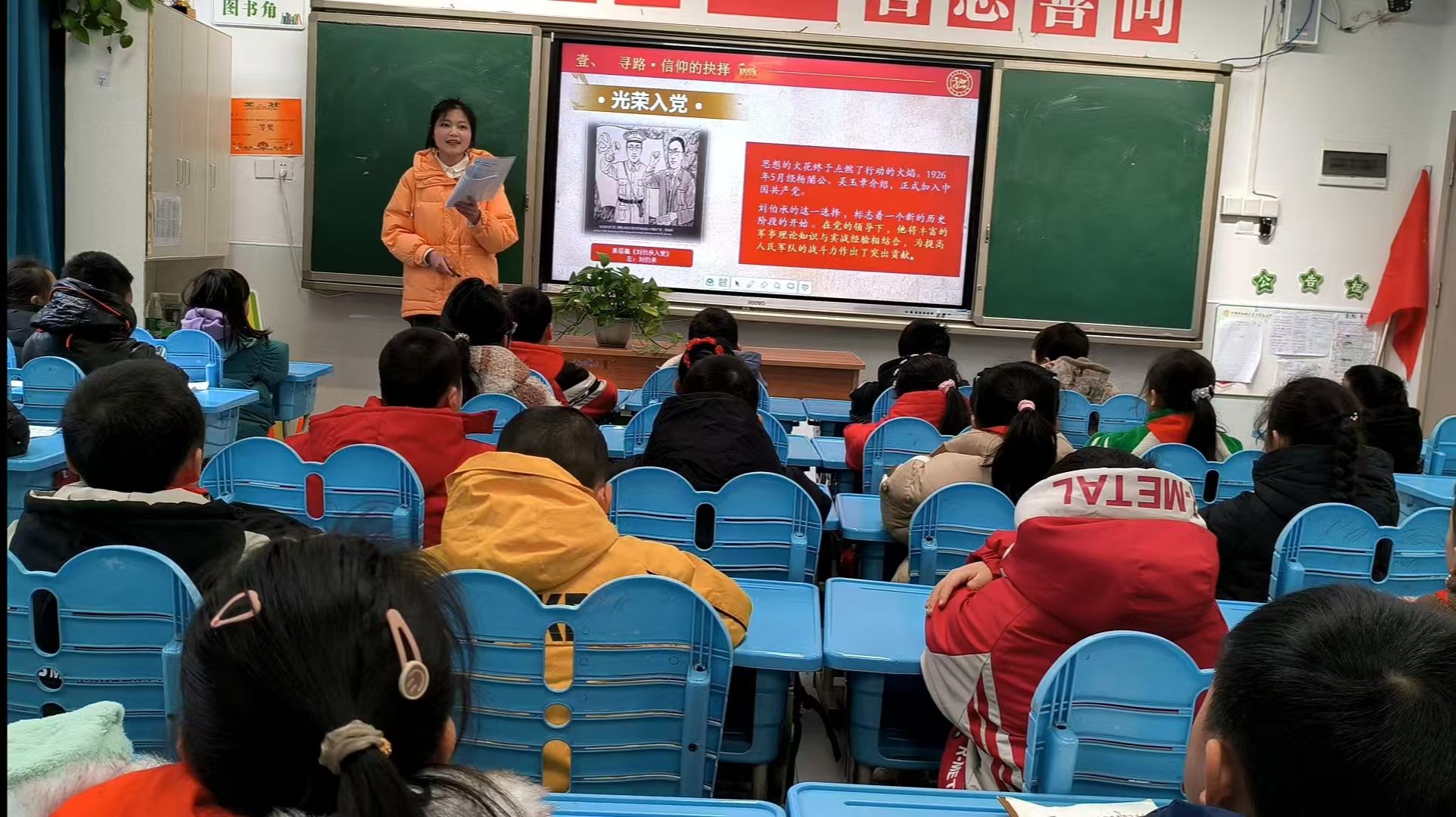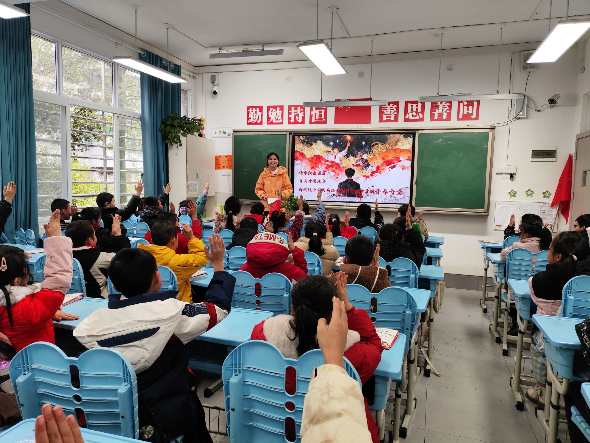 宣讲伊始,刘睿以“少年立志寻真理”为切入点,展示了青年时期的刘伯承元帅在民族危亡之时,坚定选择革命道路,确立共产主义信仰的初心历程,让同学们明白前行的根本是拥有“信仰”。随后,刘睿着重阐释了刘伯承元帅“治军必先治校”“廉洁奉公、一心为民”的精神内涵,引导同学们思考“何为有价值的人生”,鼓励大家将对英雄的敬仰转化为学习的动力,赓续红色血脉,树立远大志向。在互动环节,同学们踊跃举手、积极发言,纷纷分享自己的聆听感悟。“我要像刘伯承爷爷一样,长大以后为祖国做贡献!”一句句稚嫩却坚定的话语,道出了孩子们对革命精神的理解。宣讲结束后,不少同学还围着宣讲员追问英雄的更多故事,对入团、入党的初心使命有了更加清晰、坚定的认知。