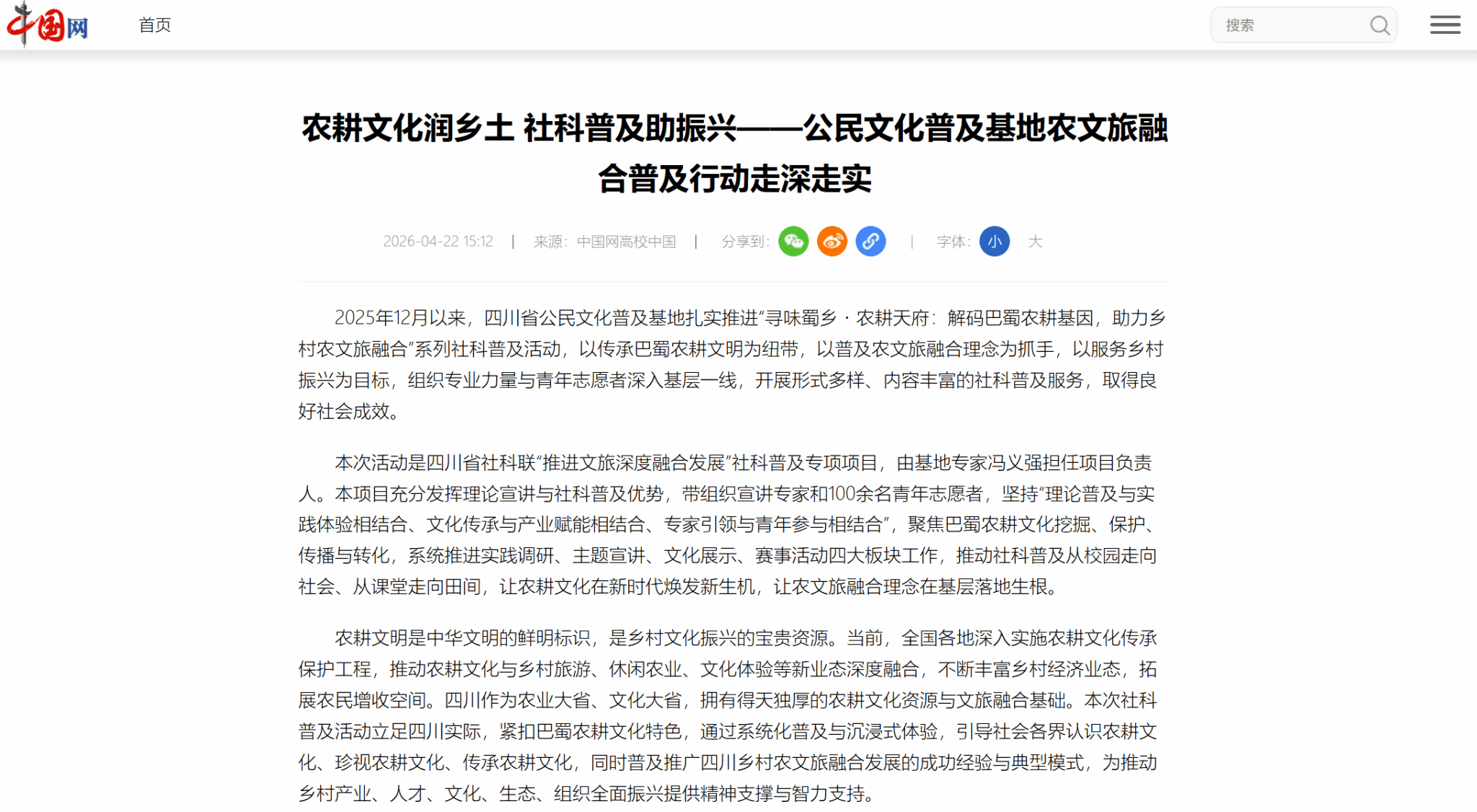 2025年12月以来,四川省公民文化普及基地扎实推进“寻味蜀乡・农耕天府:解码巴蜀农耕基因,助力乡村农文旅融合”系列社科普及活动,以传承巴蜀农耕文明为纽带,以普及农文旅融合理念为抓手,以服务乡村振兴为目标,组织专业力量与青年志愿者深入基层一线,开展形式多样、内容丰富的社科普及服务,取得良好社会成效。